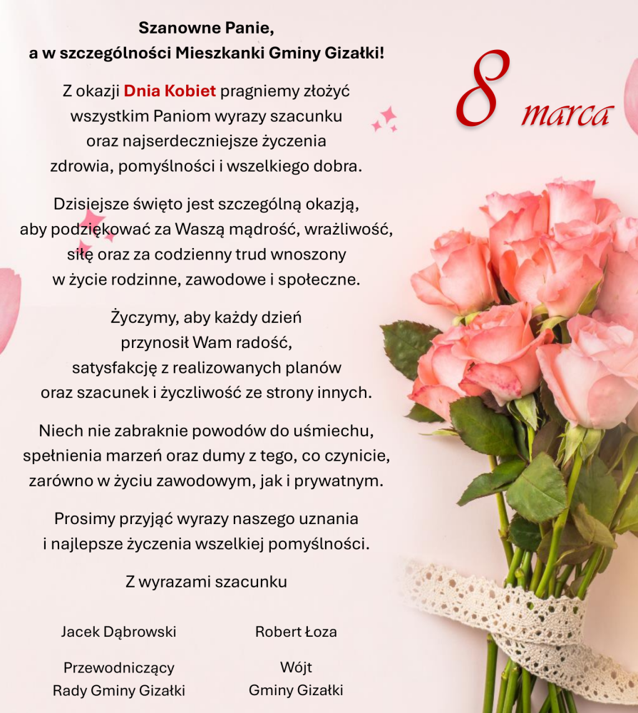 Z okazji Dnia Kobiet pragniemy złożyć wszystkim Paniom wyrazy szacunku oraz najserdeczniejsze życzenia zdrowia, pomyślności i wszelkiego dobra.